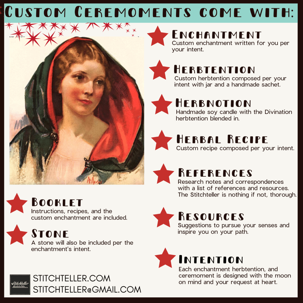 I compose and create these herbal recipes, enchantments, and reflections based on life experience, intuition, and countless years of study. It is the role of The Stitchteller to connect our common threads through story. I use words, herbs, thread and wax to do just that. Please feel free to reach out with any questions or to share your story with a custom request.